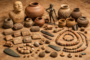 Many voices echo beneath the buried baked, bricked-walls of Indus Valley Civilization. They speak through the Bronze Dancing Girl froze mid step, te calm of the stone face of The Priest or by the beads made up of carnelian, lapis lazuli, shell and gold found in cities that were once in the hands of some young girl, forgotten in the pages of history. Many potteries, utensils, tools, toys and weights have also been found carrying the whispers of trade, belief and daily life. Among them drains, wells, granaries and planned streets stand in silence- proof of what is left behind.
